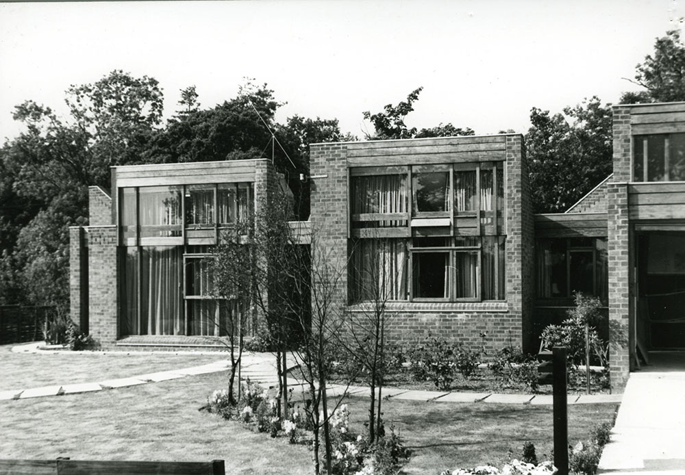 This was built in 1962 of mottled fawn bricks with cedar window frames (designed using the Fibonacci series) with every room volume expressed and angled to the views across open farmland.
